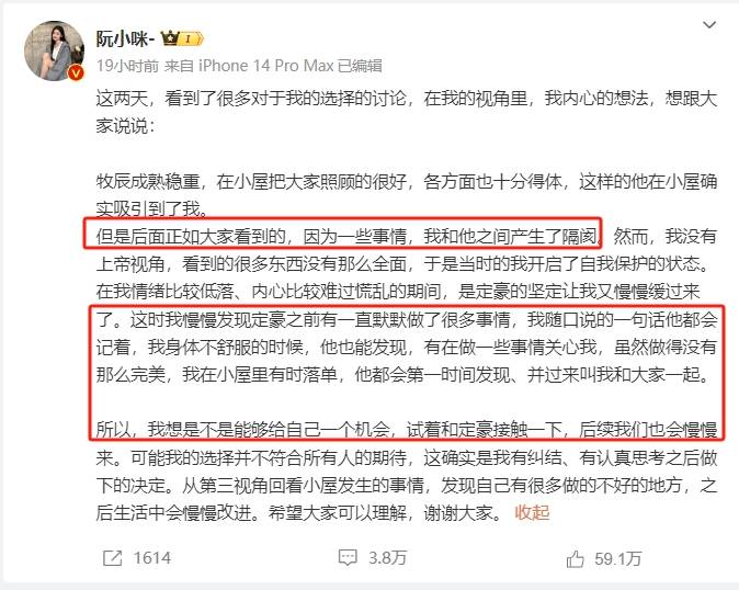 显然,阮小咪是当事人,并没有上帝视角,并不能完全清楚小屋的状况以及赵牧辰和李定豪的心理动向,只是根据当下做出了选择。而在阮小咪发文回应后,《心动》节目组官微了发布了声明,提倡大家一定要理智追综,并且力挺阮小咪等素人,针对网络上对素人嘉宾的不实言论和造谣,将保留采取进一步法律手段的权利。