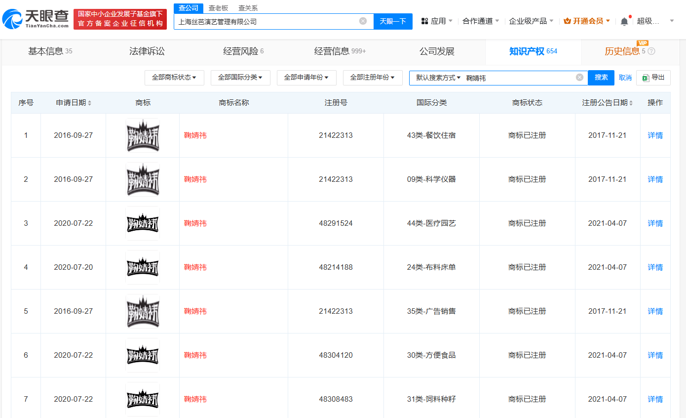 据知识产权信息显示,该公司已于2022年备案了鞠婧祎.cn、ju-jingyi.com、ju-jingyi.cn、ju-jingyi.com.cn网站域名,上述域名打开均为“鞠婧祎官方网站”。此外,丝芭传媒旗下上海丝芭演艺管理有限公司已申请多枚“鞠婧祎”商标,商标状态均为已注册。