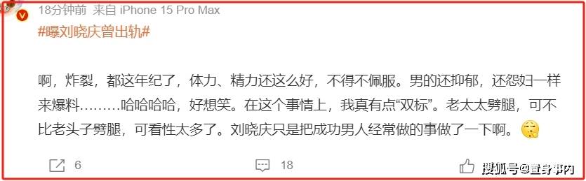 也有网友表示:“没啥大惊小怪的,刘晓庆只是把成功男人经常做的事做了一下。而且老太太劈腿,可比老头子劈腿的可看性强多了。”