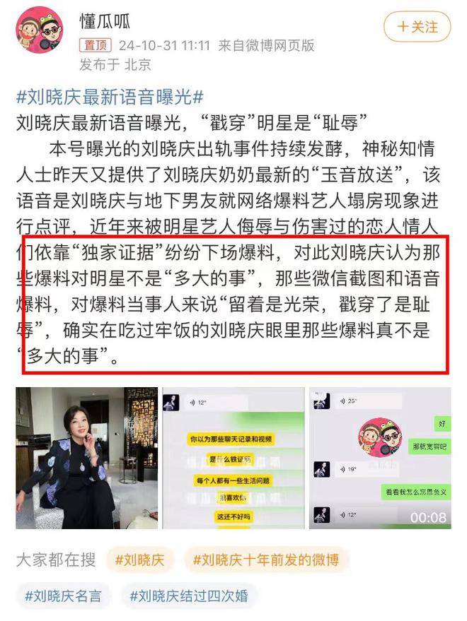 第二弹爆料刘晓庆对小男友说,这些隐私爆料不是多大的事,曝光两人的聊天记录和视频,是对方的耻辱,留着对他来说是光荣。刘晓庆可能认为自己大明星,小男友没什么名气,和自己发生恋情,应该是很自豪的一件事,小男友不应该感到自卑。