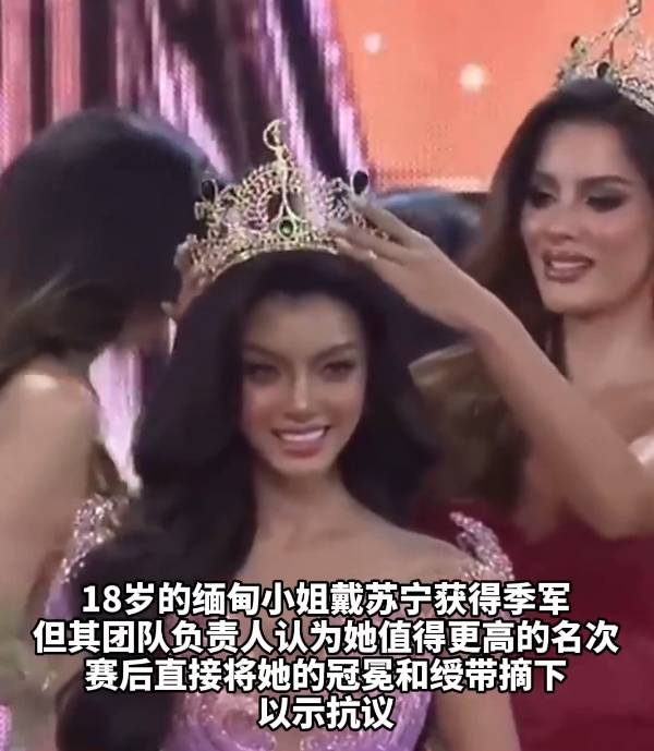 报道称,缅甸团队负责人在戴苏宁刚走下舞台时就愤怒地摘下了她的冠冕和绶带,来自印度的冠军古普塔惊讶地目睹了这一幕。戴苏宁表示:“我参赛就是为了得第一,我相信我应该获得更高的名次。”泰国主办方则立刻召开新闻发布会,称:“如果她想要且必须得到冠军,建议她举办自己的选美比赛。”缅甸团队还指责主办方有“用冠冕索要报酬”之嫌,主办方则表示缅甸团队涉嫌财务违规,并以“缺乏体育精神和商业信誉”为由将缅甸团队负责人禁赛。