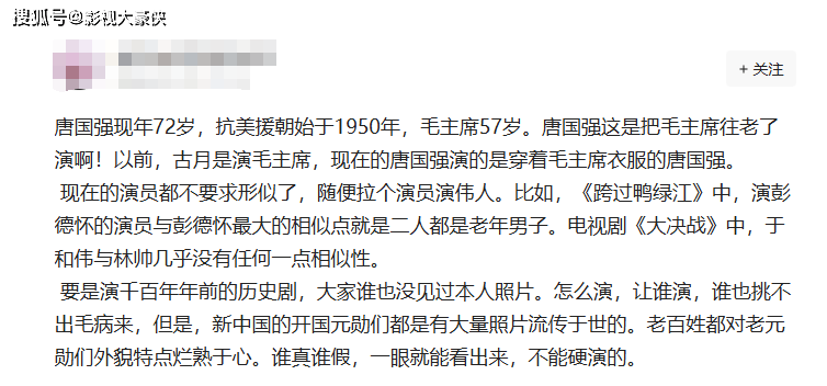 关键唐国强今年都72岁了,可抗美援朝的时候伟人才五十出头,演员与角色相差了将近二十岁的年龄差,这真的能演好吗?