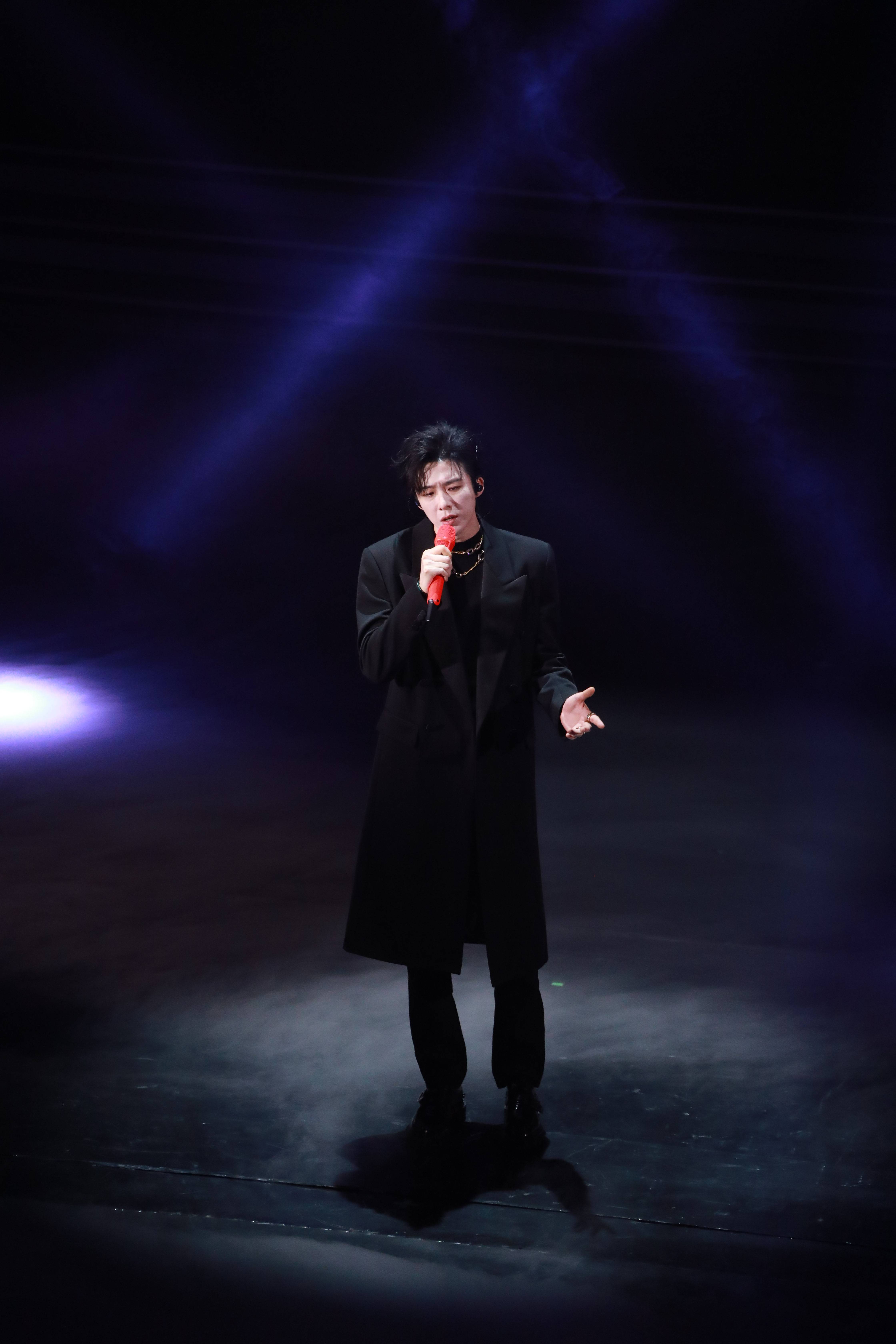 刘宇宁手拿红色话筒唱歌,魅力十足。