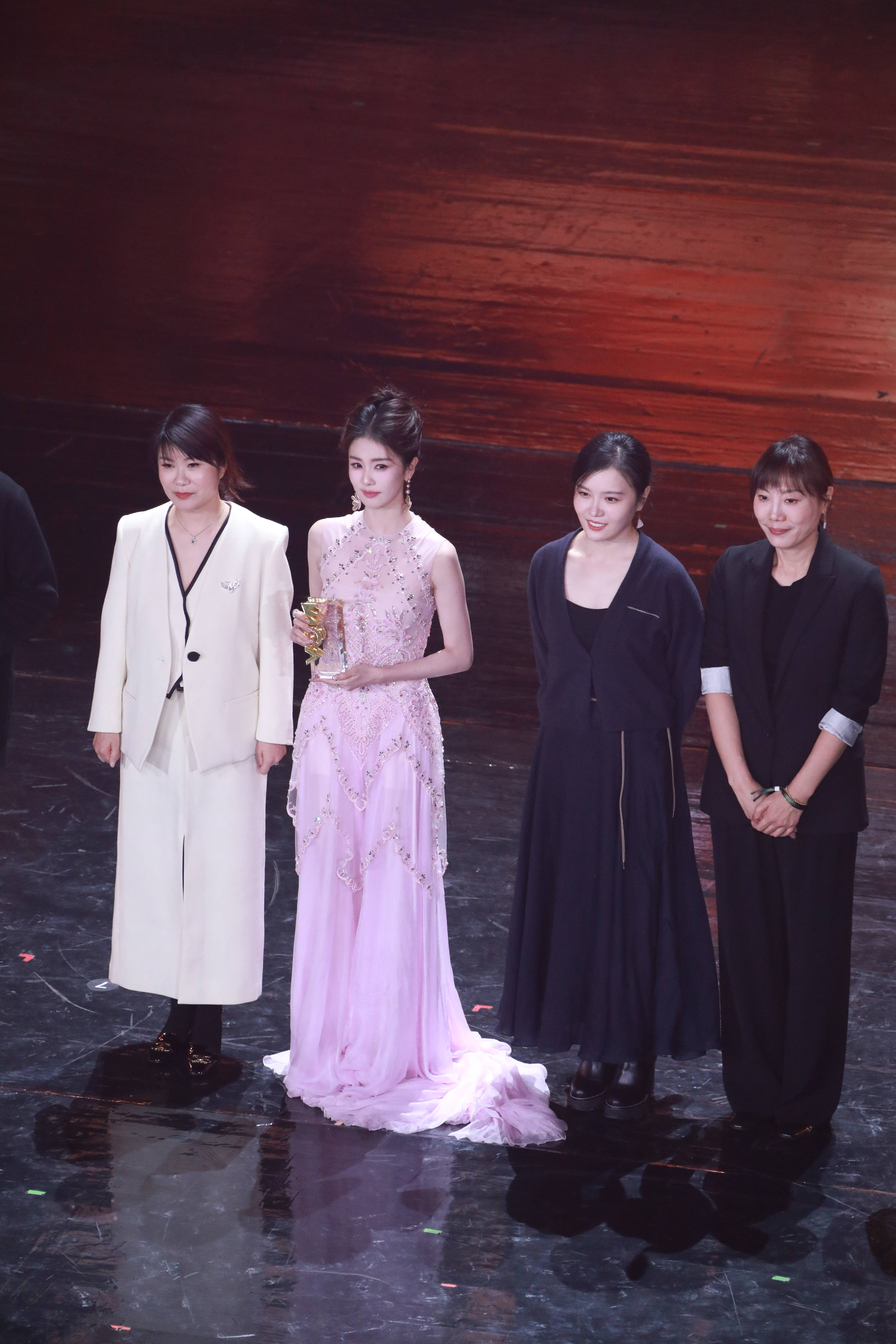 刘亦菲手捧黄玫瑰登台,明媚动人。