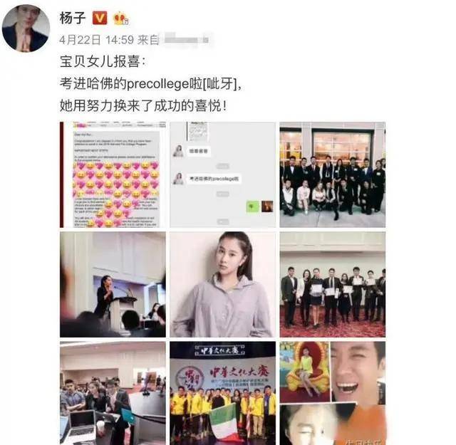 杨海润被哈佛录取时,杨子发文祝贺女儿。