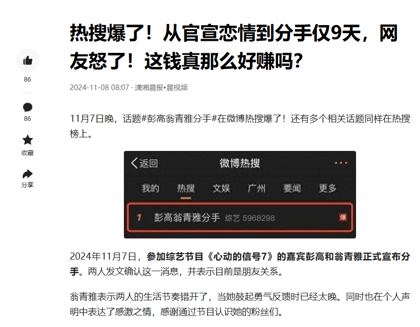 没错他们就是翁青雅和彭高这对曾经的“CP”,官宣结果到分手,短短几天。