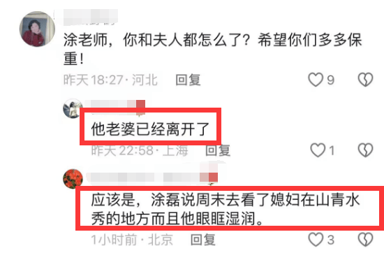 涂磊在直播中提到妻子是这样描述的,周六周日去看媳妇去了,她在一个地方休养,山清水秀的好地方。