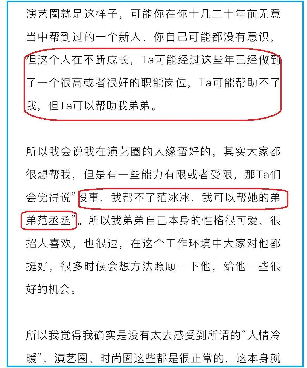今年三月份,范冰冰接受采访时,就毫不忌讳地透露:昔日自己帮助过的人,后来到了很高职位,知恩图报,“帮不了我,但Ta可以帮助我弟弟”。