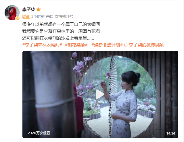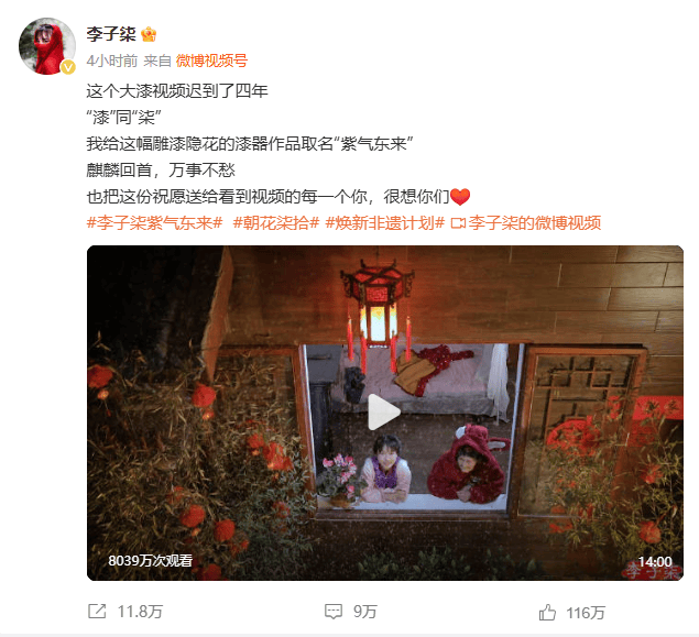 11月12日下午,李子柒在微博连续发了两条14分钟的新视频宣布回归。截止发稿前,两条视频累计播放量已过1亿。