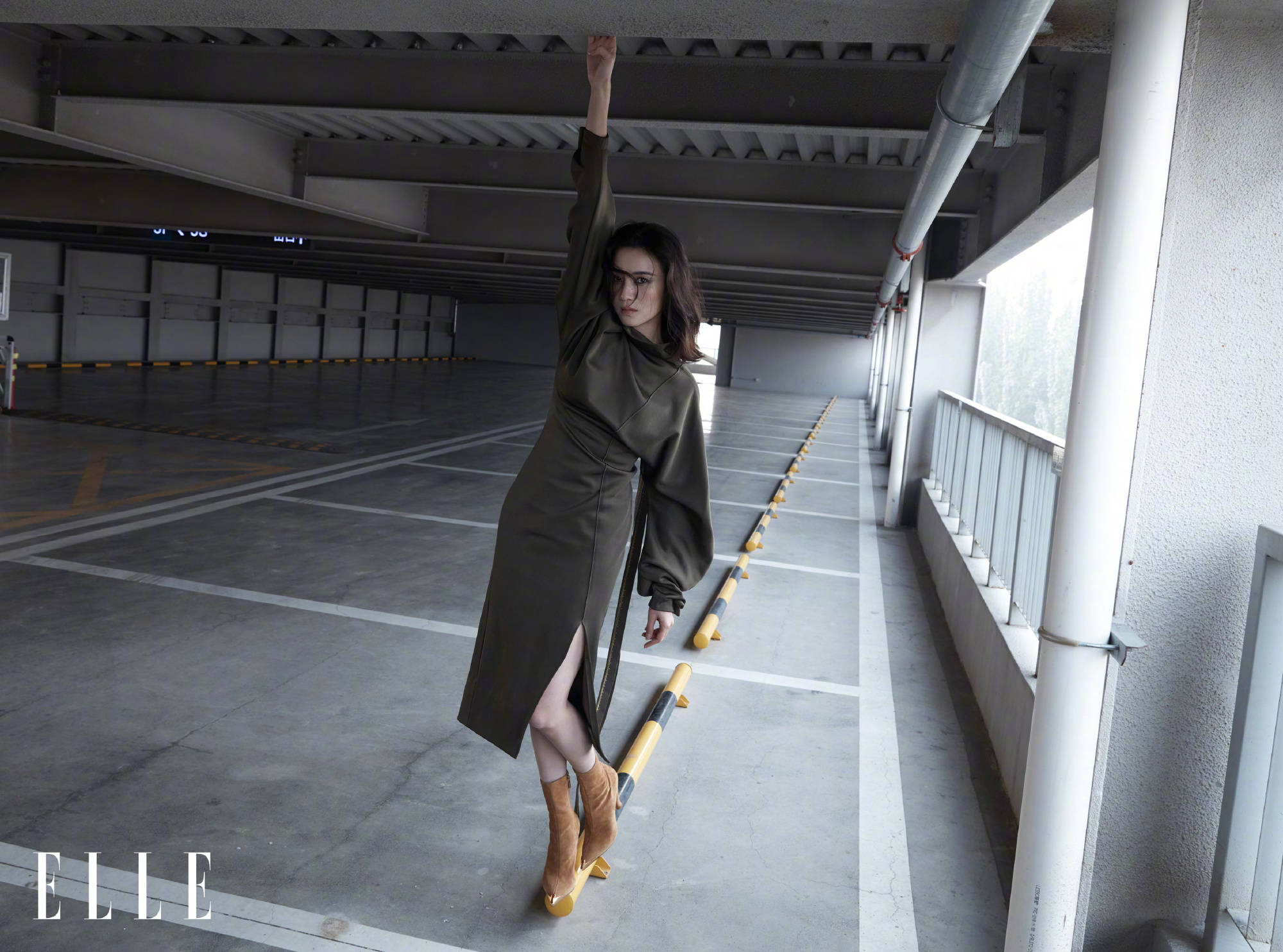 宋佳身穿卡其色抹胸长裙优雅知性。