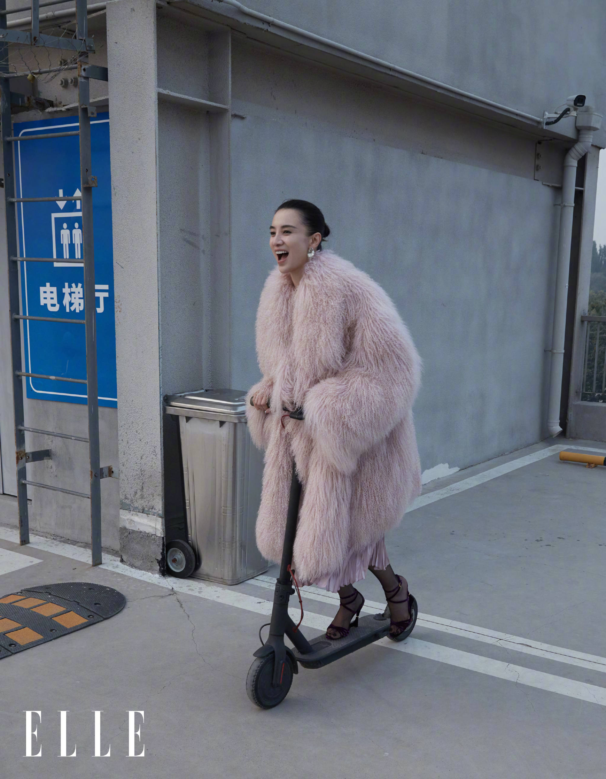 宋佳身穿粉色毛绒大衣骑滑板车。