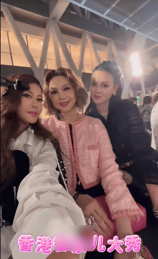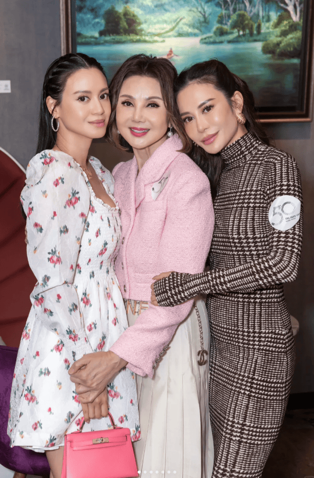 活动上,母女三人同穿该品牌套装,搭配当季限量款手包,站在中间穿粉色短外套的人正是已经68岁谢玲玲。