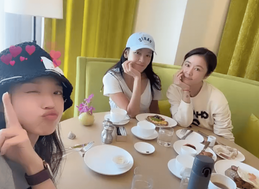 舒淇林心如林熙蕾三人一起吃饭,舒淇嘟嘴比耶。