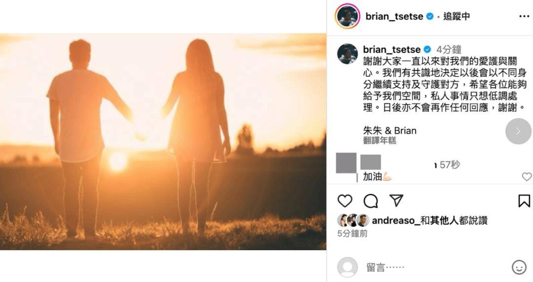 谢东闵和朱智贤分别发文称:“谢谢大家一直以来对我们的爱护与关心。我们有共识地决定以后会以不同身份继续支持及守护对方,希望各位能够给予我们空间,私人事情只想低调处理。日后亦不会再作任何响应,谢谢。”