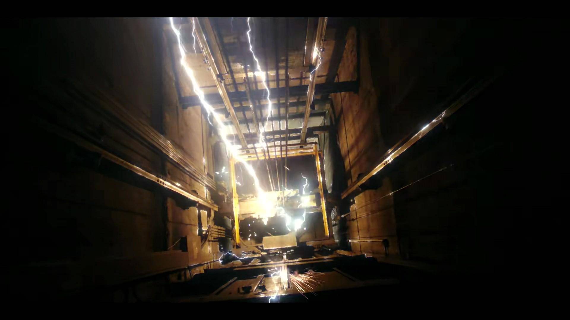 此时,天空一道电光闪过,一束光束直通大厦电梯。