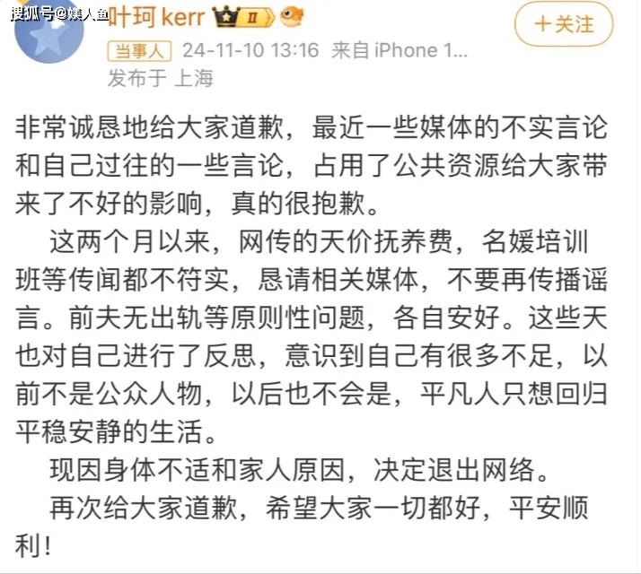 而叶小姐也很识趣,为了把影响降到最低,主动的道歉,并且解释这一段时间发生的事情,然后又把自己的各种社交账号给注销了,直接选择退网,这说明叶小姐还是很听话的。