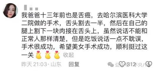 评论区很多人留言安慰她,告诉她切除舌头不会太影响生活,希望她可以保持好心态,不要被接二连三的癌症打击到。