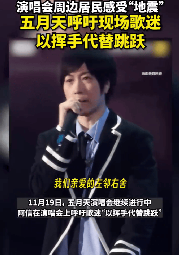 搜狐娱乐讯 近日,五月天在上海举办演唱会,体育场附近的居民反映家里的铝合金窗强烈抖动、水瓶里的水左右摇摆,如同地震。11月19日晚,阿信在演唱会上回应此事,他说到:“因为大家的热情,导致体育场周边的左邻右舍感受到了地震”,并呼吁大家以挥手代替跳跃。
