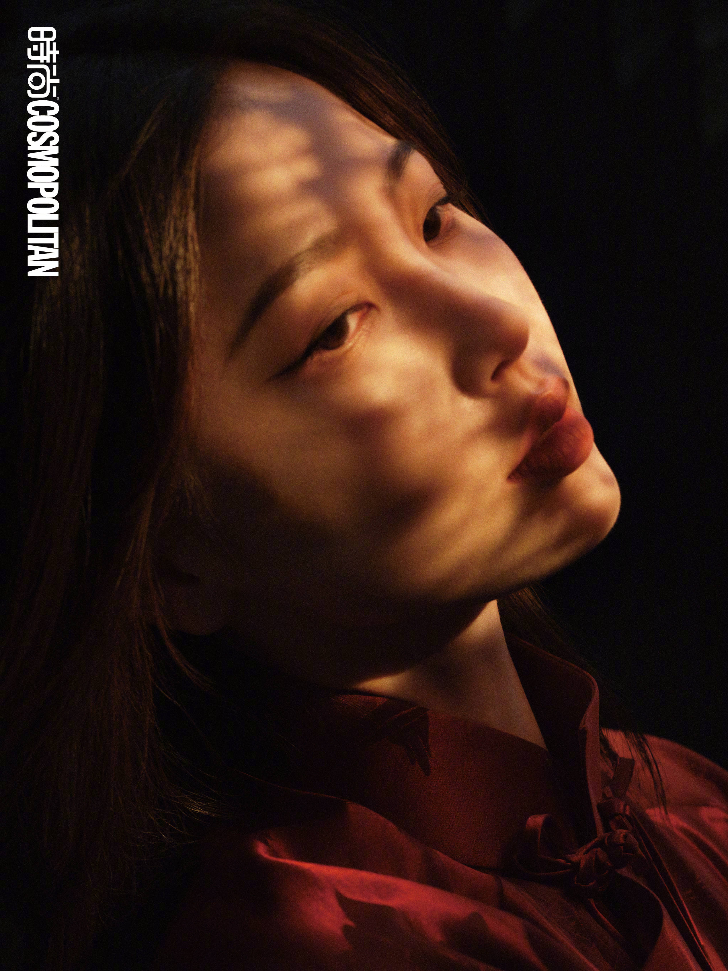 虞书欣穿红色丝绸长衣,站在红墙下,很有中式美学的感觉。