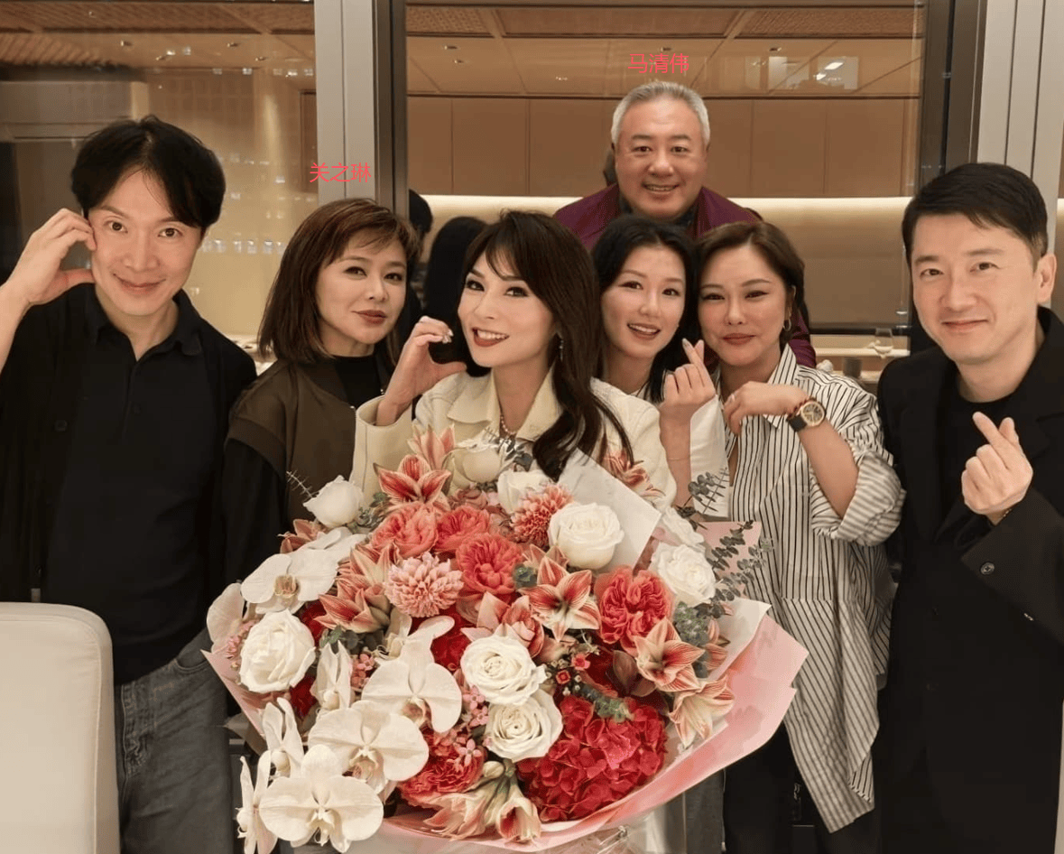 关之琳近日为富婆好友邱李茂琪庆祝生日,邱李茂琪在社交平台分享一张合照,关之琳站在前排位置,前男友马清伟则站在后排,已是满头白发。
