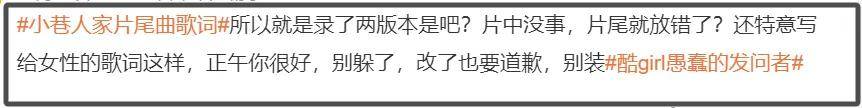 最有意思的是剧方的这通操作,网友特意进行了对比,同样的一首歌,放在片中播放时,一切正常,没有篡改。可是到了片尾,歌词就悄悄被篡改了,大家听到的就变成了“女孩,愚蠢…”。显而易见,这首歌曲录了两个版本,一个是正能量版,一个则是网友所说的“厌女”版。