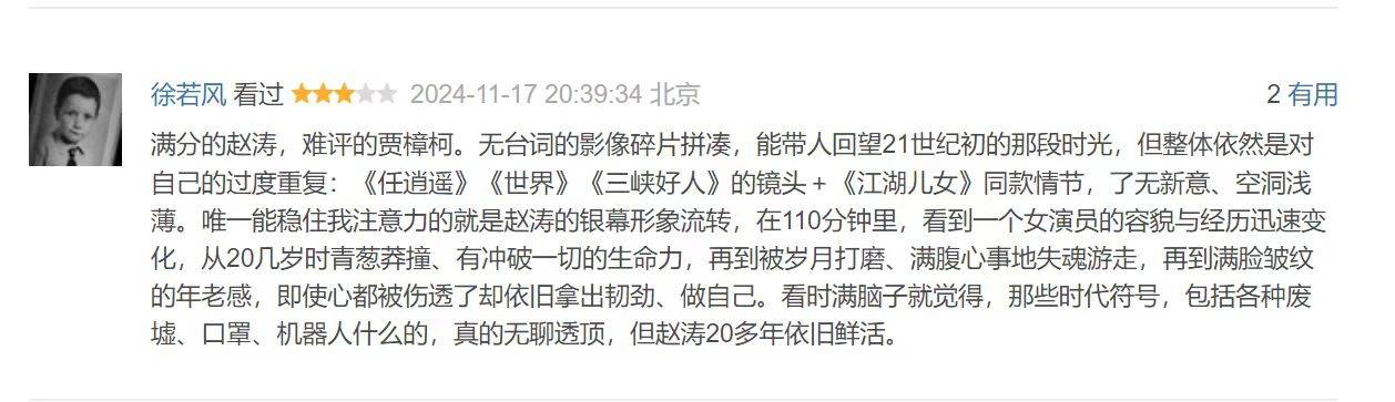 因为电影实在是没有办法吹捧,就连知名影评人徐若风,也只能做到半褒半贬。他的评论一半夸赵涛,一半批贾樟柯: