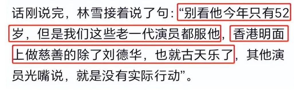 香港演员林雪就曾说过,在港圈明面上做慈善的,就只有刘德华和古天乐了。