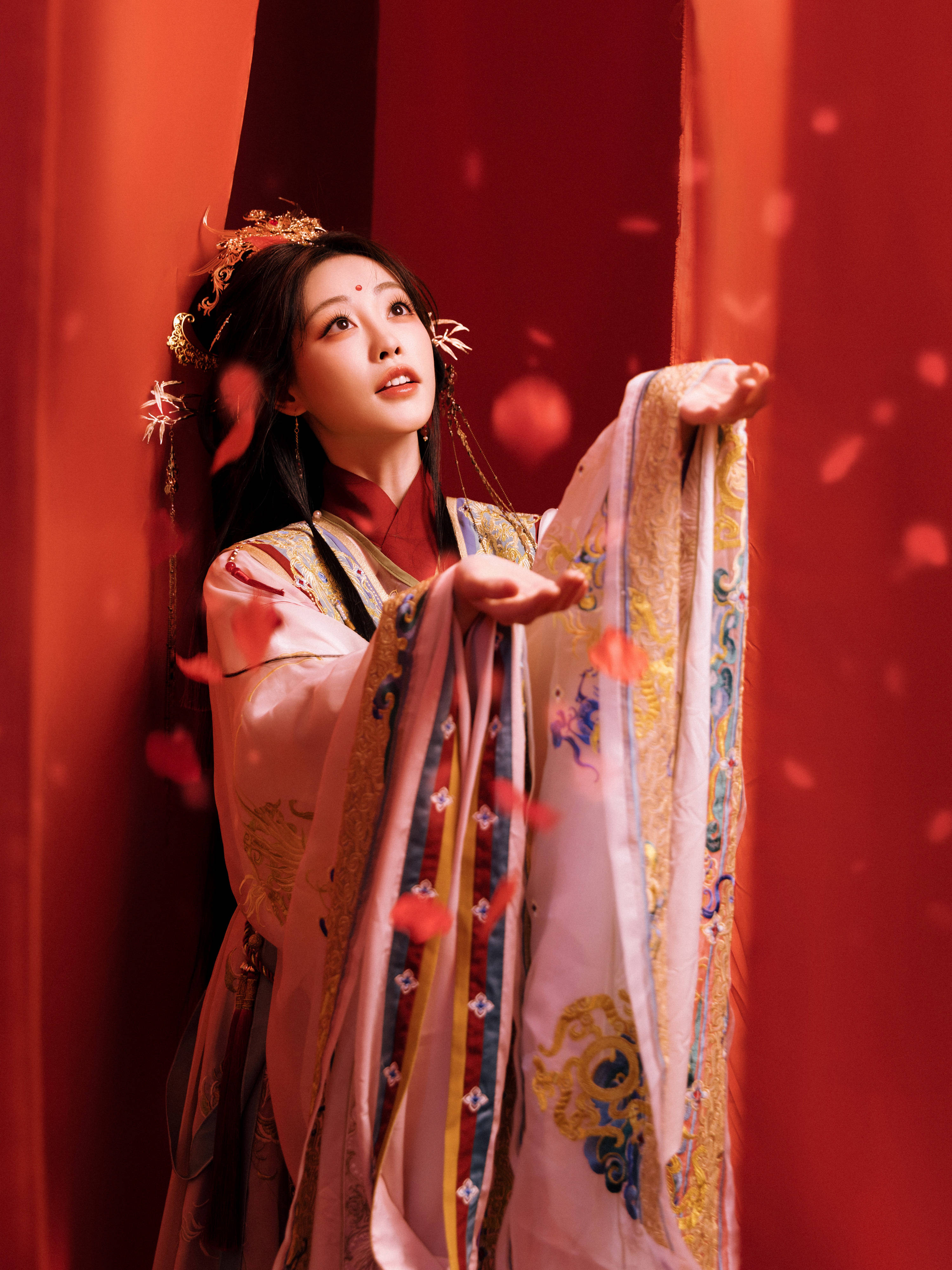 祝绪丹伫立于花瓣海中,微微低头似沉思。
