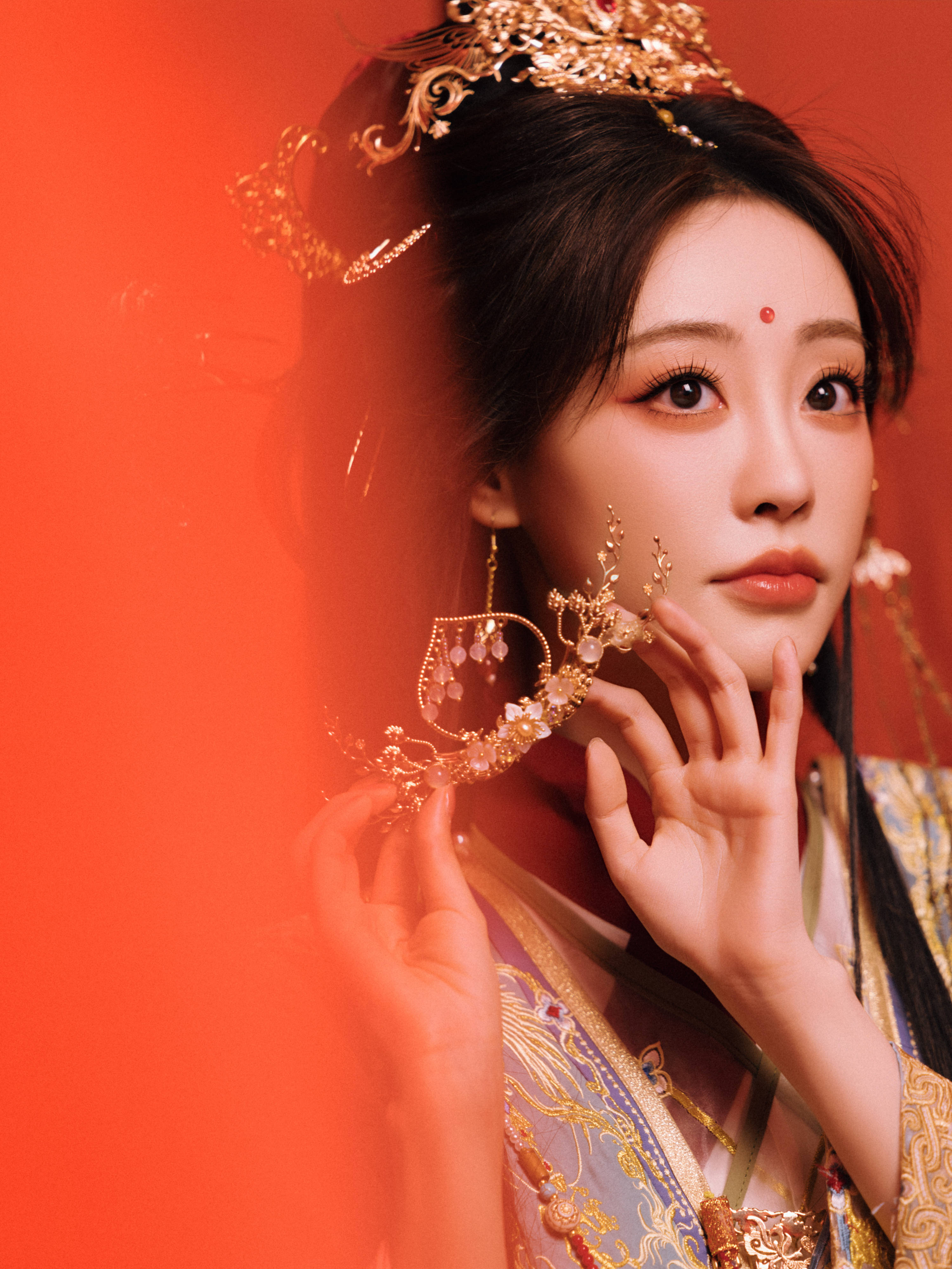 祝绪丹手拿华丽头饰,充满古风韵味。