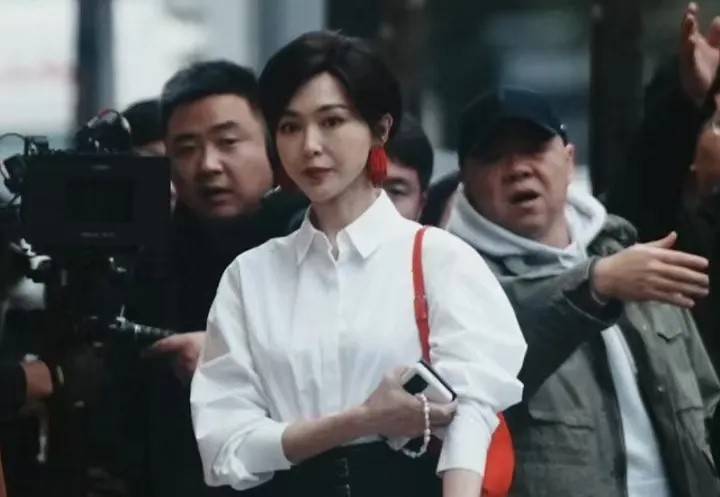 她穿着一件白色衬衣,很符合人物在剧中的设定,但是从路透图来看,她的状态很不乐观,脸显得有些浮肿和僵硬,能够看得出很强的年龄感。