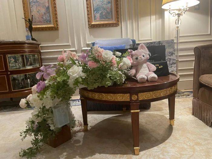 进入房间,室内布置比我想象得要更加简单。精心的摆设大多集中在茶几上,一大簇从茶几垂到地板的花——假的;几个迪奥和香奈儿的袋子——空的;地上还有一捧巨大的999朵玫瑰花——塑料的。我还看到了社交媒体上照片里标配:奢侈品包和一个玲娜贝儿的玩偶,“都是假的”,婷婷丝毫没有避讳。