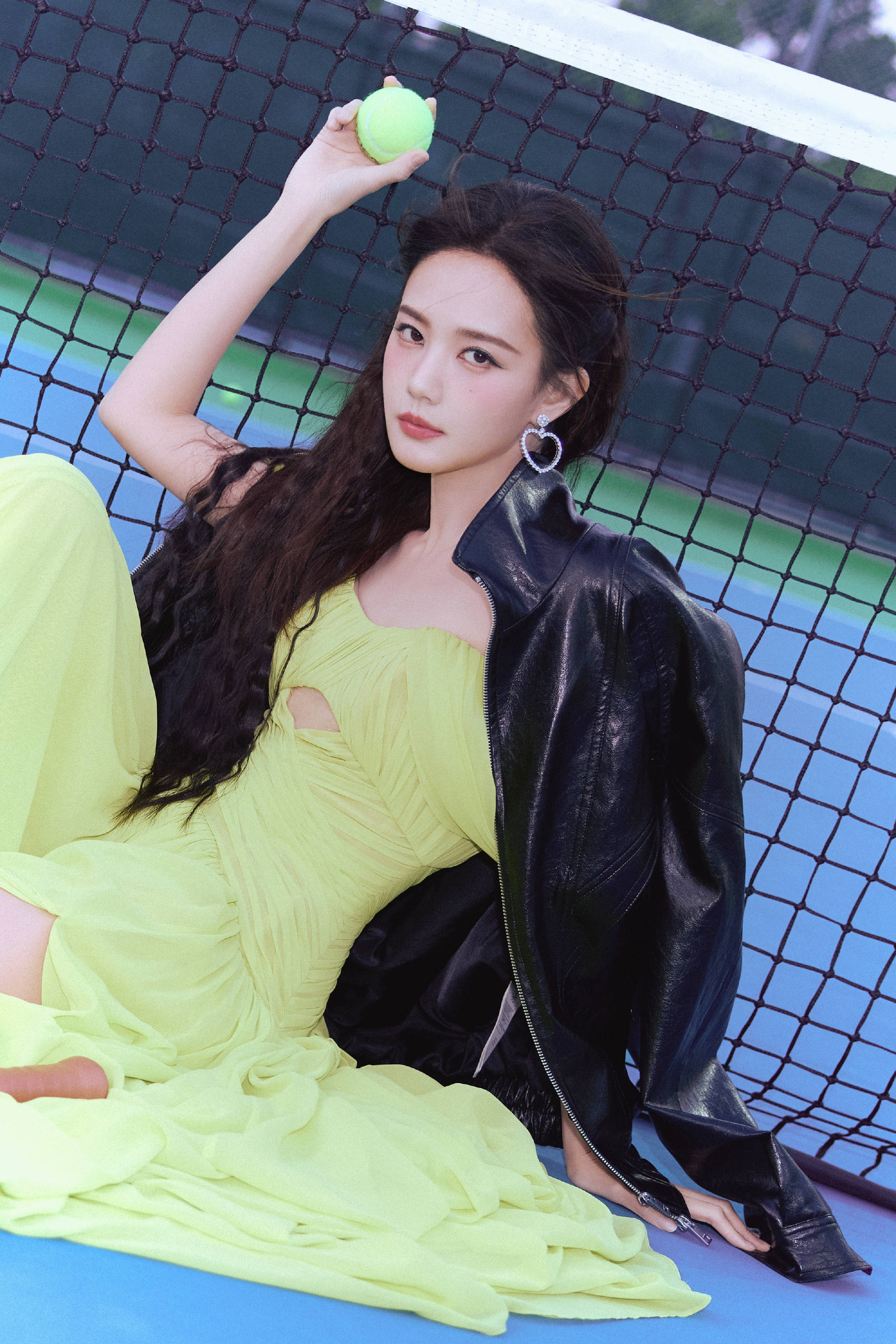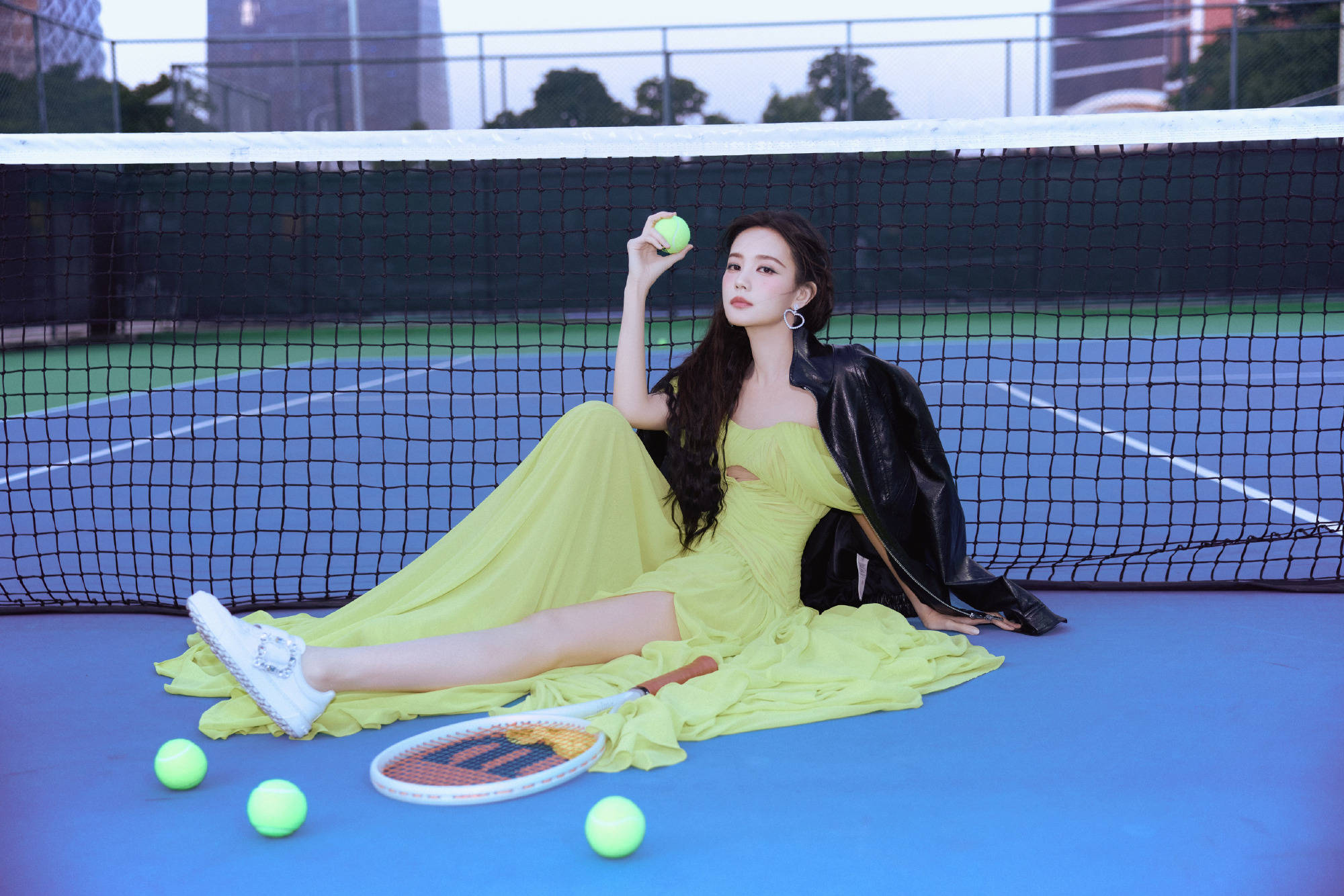 李一桐身穿绿裙打网球。