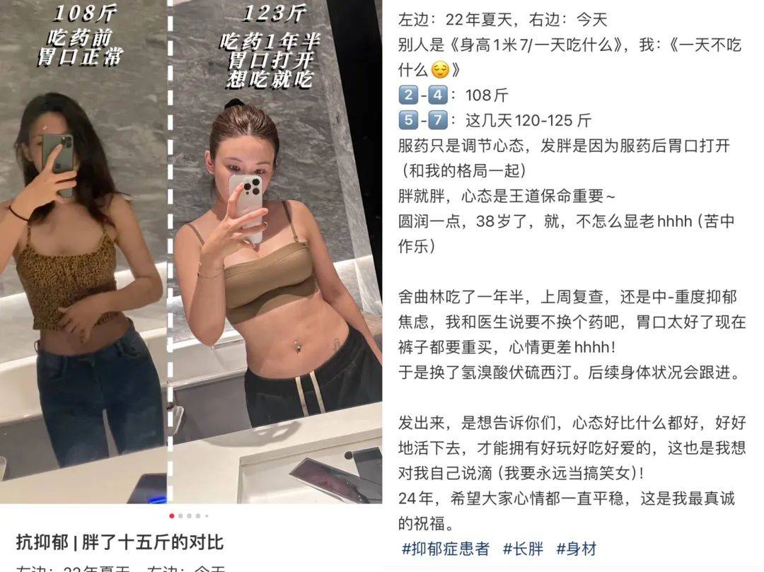 今年2月她分享自己抗抑郁经历,吃药两年,胖了15斤,复查还是中-重度抑郁焦虑。