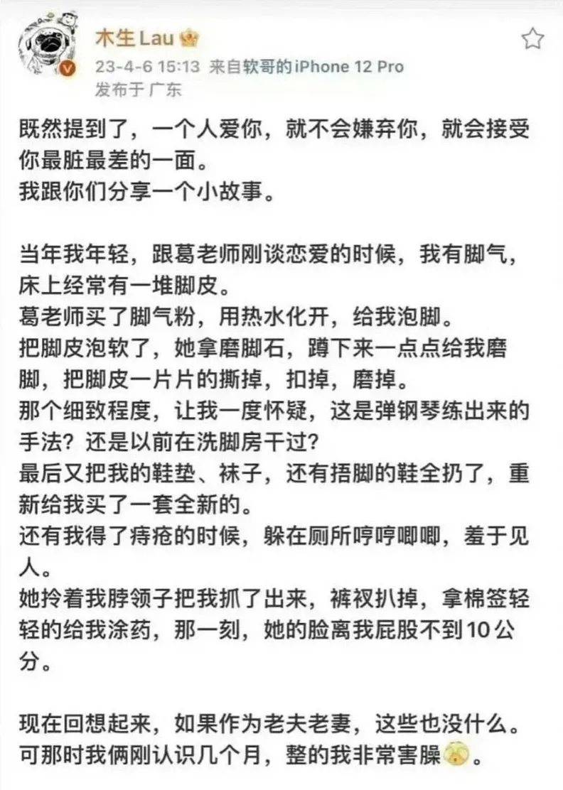 甚至在恋爱初期,对刘爽的照顾就堪比呵护,给刘爽泡脚、磨脚、治脚气;拿棉签给他涂药膏治痔疮,脸距离屁股不到十公分。无条件接受他“最脏最差的一面”。