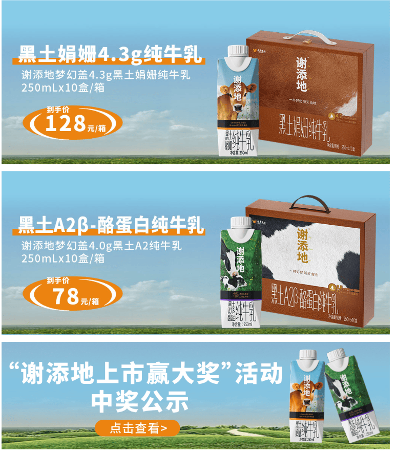 “谢添地”的 slogan 简短有力:一杯好奶,听天由地。 一如既往的乳企逻辑,从种草开始养牛,把风吹草低见牛羊的田园牧歌假想和产品联系到一起,仿佛喝了这口奶就有了上辈子在大草原上奔腾的回忆。