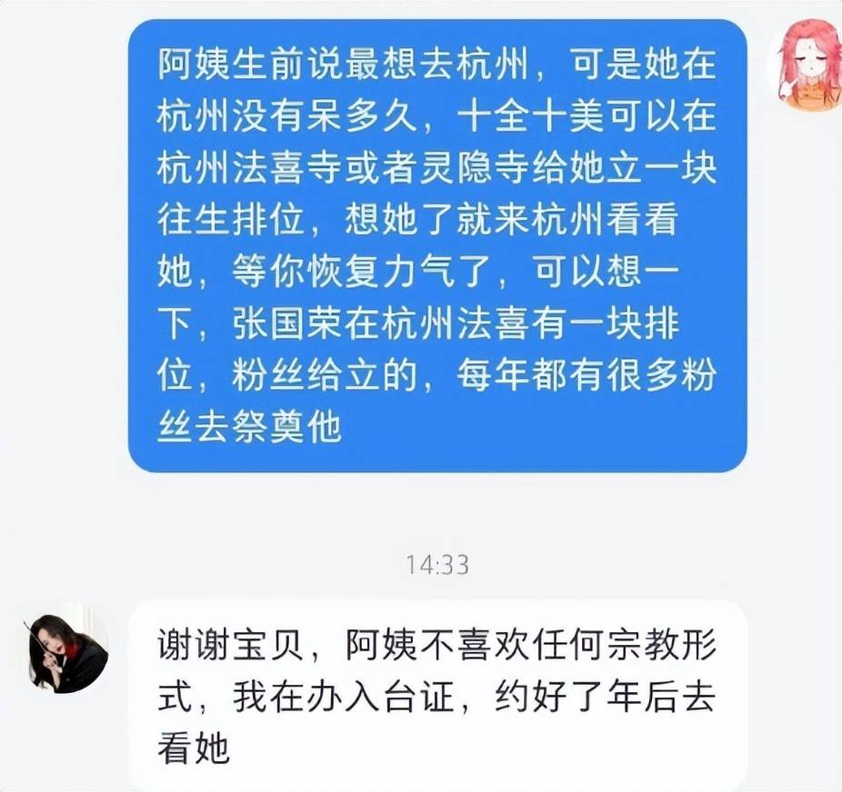 李晟随后也回复了网友的建议,她表示琼瑶不喜欢这样的方式,所以自己不会在内地给她设立什么往生牌位,不过李晟同时也表示,自己已经和几个人约好了,大家现在都在办理入台证,打算在年后去台湾祭拜琼瑶。