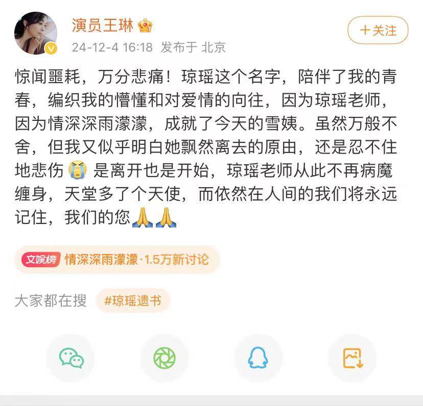 雪姨王琳也发文悼念琼瑶,表示对于琼瑶的离世万分悲痛,这个名字陪伴了她的青春,编织了她懵懂和对爱情的向往,因为琼瑶老师,因为《情深深雨濛濛》,成就了今天的雪姨。她的确是凭借这个角色获得很多的红利。看来她们很少联系,或许根本就不联系,琼瑶其实没有什么大病。