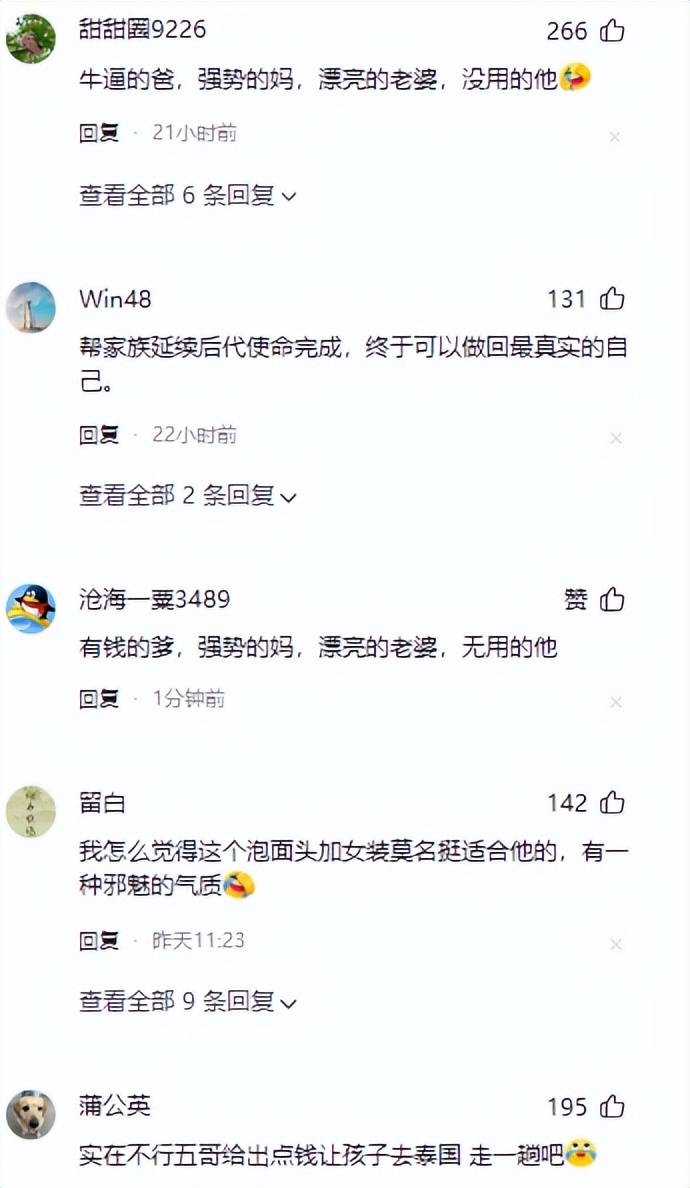 其实也不是,如那个热评“成功的爸,强势的妈,漂亮的老婆,没用的他”,这个他肯定看到过,所以才会有种“我要做我自己,而不是向太的儿子和郭碧婷的老公”。