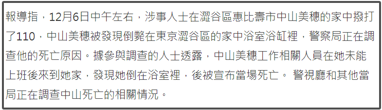 目前日本警方还没有公布中山美穗具体死因,只是对外透露她于家中浴缸离世,有人前往她家中探望,发现中山美穗倒在浴缸中,连忙报了警,可惜为时已晚,都来不及送往医院,中山美穗就确认死亡了。