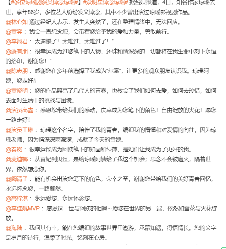事实上也是如此,琼瑶去世,震惊娱乐圈,众星悼念,比如包括但不仅限于陈德容、黄晓明、古巨基、苏有朋、林心如、寇振海、王琳、黄奕、保剑锋、李翊君、陈志朋、金铭、高鑫、秦岚、高梓淇、阚清子、李佳航、海陆、邱心志、孙耀琦、麦迪娜、林心如、寇振海、林心如、林青霞等等一大批明星,通过微博发文,或者通过采访发声,表示悼念,还有很多很多参演过琼瑶作品的,估计都会感叹,甚至连这几年因为各种事件身份敏感低调的某薇、某冰冰和某嘉倪等,都不避嫌发文悼念,这一天仿佛也成了敏感女星放水的日子。