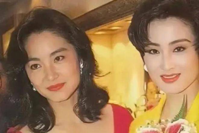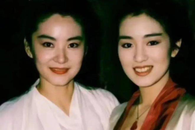 两位大美女的同框合照中林青霞直视镜头,目光炯炯有神,浓华艳丽的五官立体对称,骨相优越,充满自信,王祖贤眼神看旁边,嘴唇微抿,笑意略显,有些妩媚仿佛在不经意之间流露。