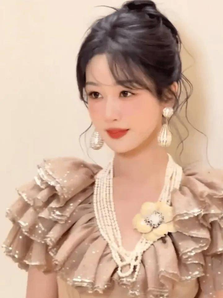 她身着一件精心设计的高定礼服,裙身以细腻的银丝织就,镶嵌着点点璀璨的钻石,她俏脸清丽脱俗,盘起了发髻,气质优雅,美得让人窒息!