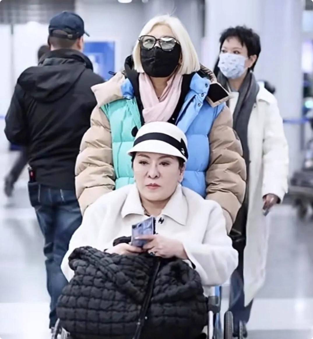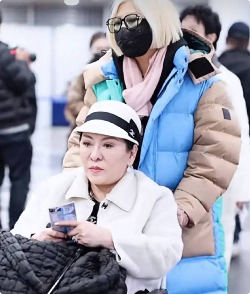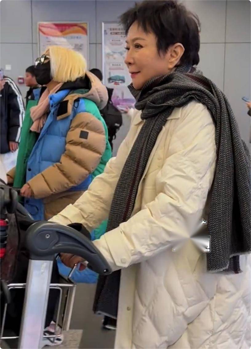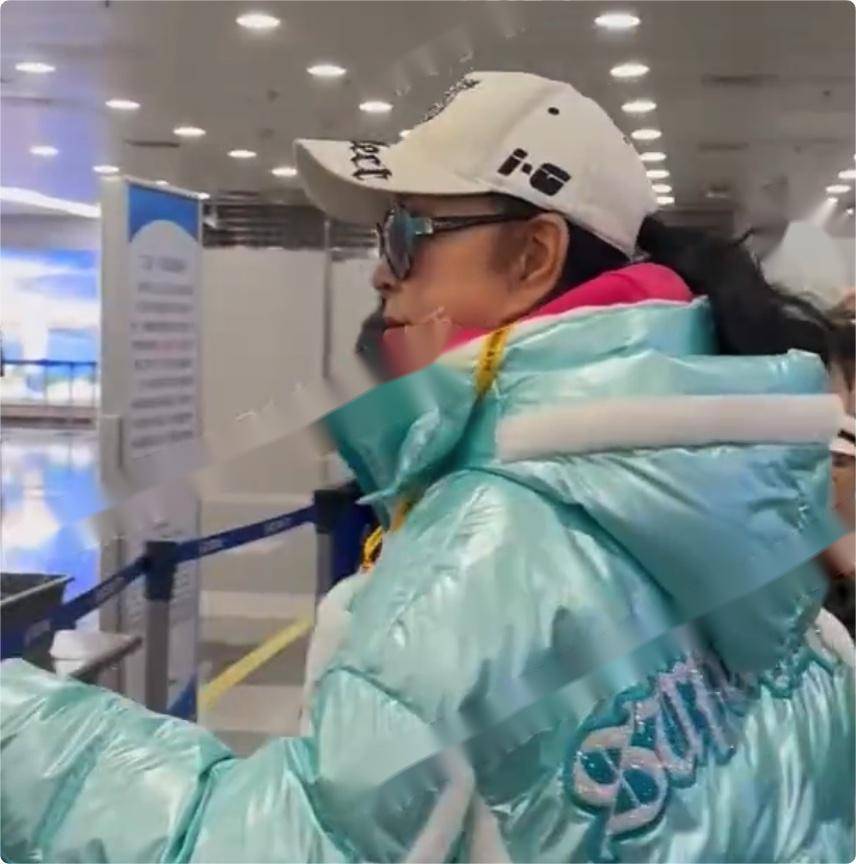这次北京机场,刘晓庆一身蓝色的羽绒服大衣,内搭粉色的卫衣长衫,下身则是黑色长裤和高跟靴,从头到脚可以说是又保暖又时尚。
