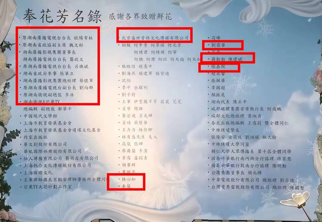 没有看到第一代捧红的明星,比如林青霞、秦汉、秦香林、林凤娇等,可能他们以公司的名义赠花,捧红的内地明星也很多,比如黄晓明、李晟、麦迪娜、海陆、周杰、秦岚、张嘉倪、蒋勤勤、保剑锋、高鑫等。
