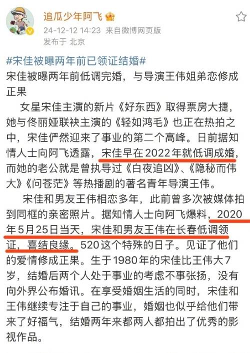 知名娱记【追瓜少年阿飞】爆料说,【宋佳在2011年5月20日就和王伟领证结婚了!】