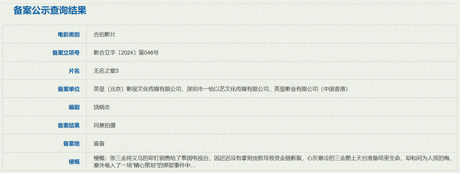 饶晓志编剧电影《无名之辈3》立项,备案单位:英皇(北京)影视文化传媒有限公司、深圳市一怡以艺文化传媒有限公司、英皇影业有限公司(中国香港)。