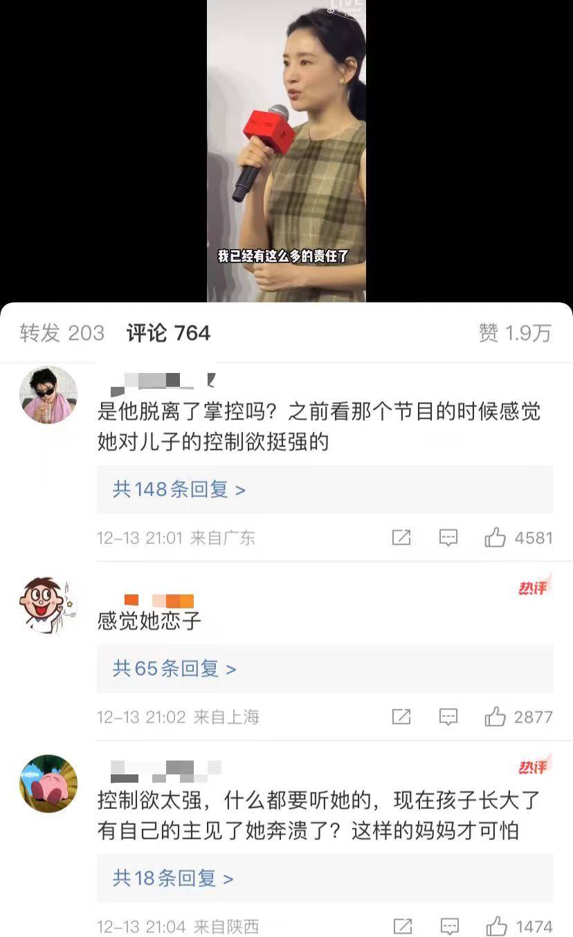 网友看过她带儿子录制的综艺节目,认为董洁对儿子的控制欲很强,所以会说儿子小时候很听话,大了就不听话,产生这样的失落感,其实董洁自己应该自我反思,估计她已经在反思,所以她不知道自己是谁。她只是孩子的妈妈,儿子不是她的私有物品,应该给儿子自由和空间,就像结婚后不能视老公为自己的私有物品,也应该给老公信任、自由和空间。