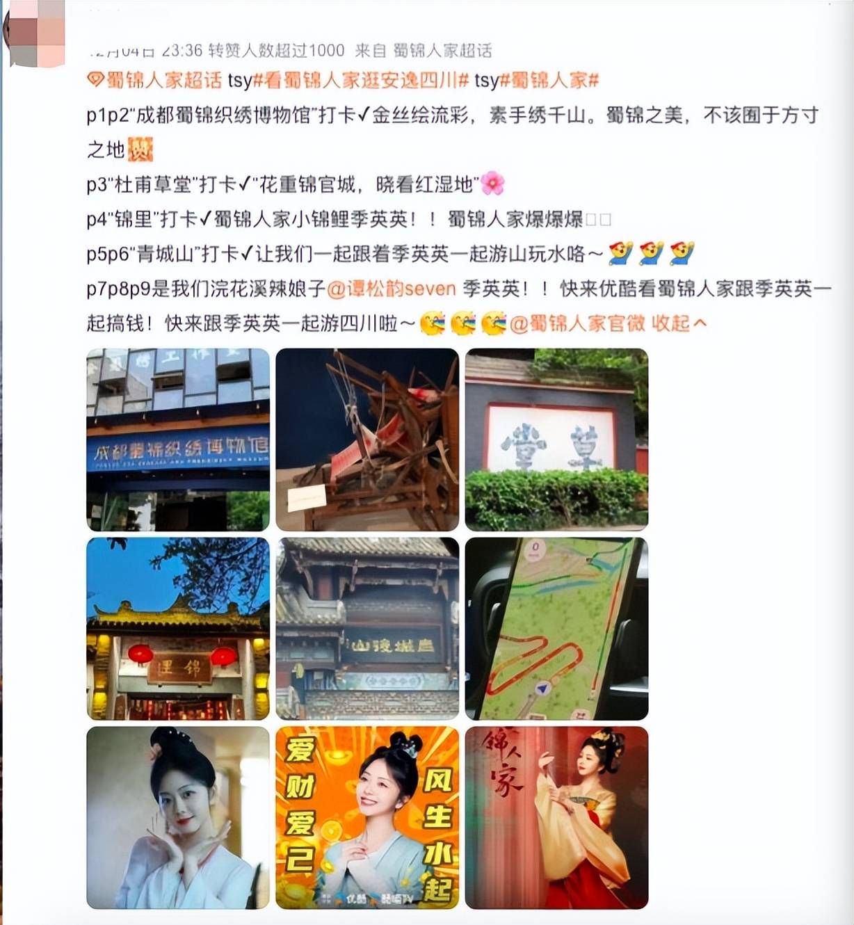 此外,还有不少网友晒出了打卡成都蜀锦织绣博物馆、青城山、杜甫草堂的照片,相关元素在剧中皆有呈现。《蜀锦人家》也被网友调侃为“四川文旅宣传片”。