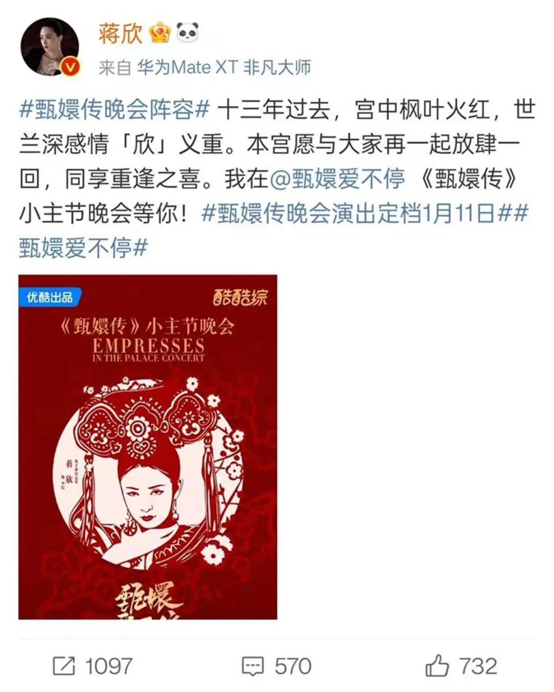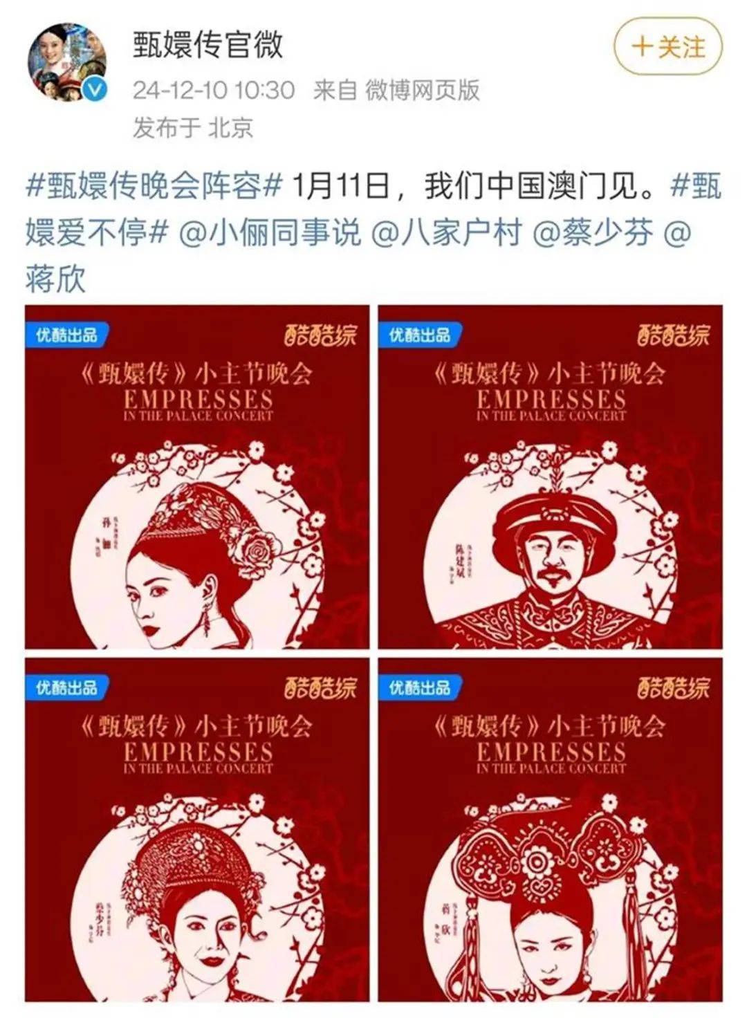12月10日,在甄嬛传晚会官宣后,“皇上”和“娘娘”们也发文预热。