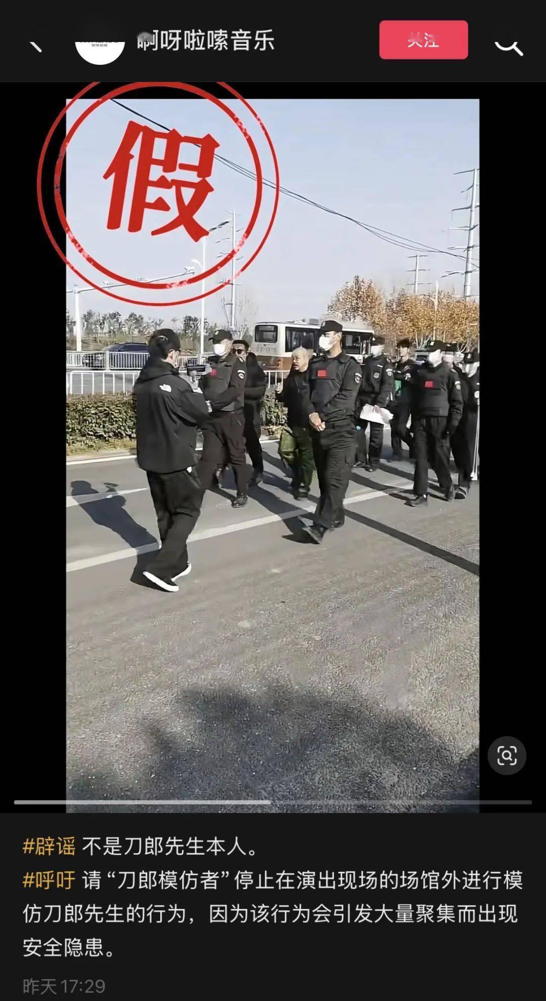 啊呀啦嗦音乐官方抖音号@啊呀啦嗦ayalaso表示:现场并非刀郎先生本人,并呼吁“刀郎模仿者”停止在演出现场的场馆外进行模仿刀郎先生的行为,因为该行为会引发大量聚集而出现安全隐患。